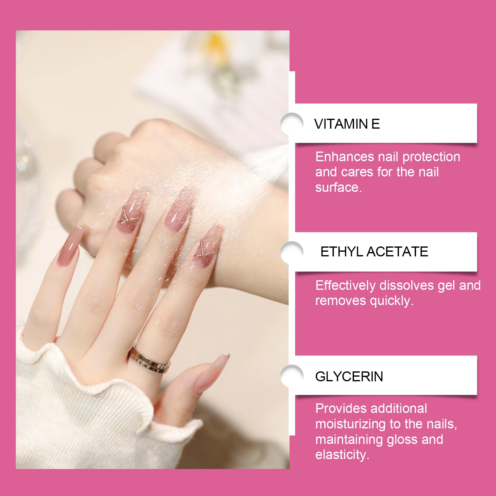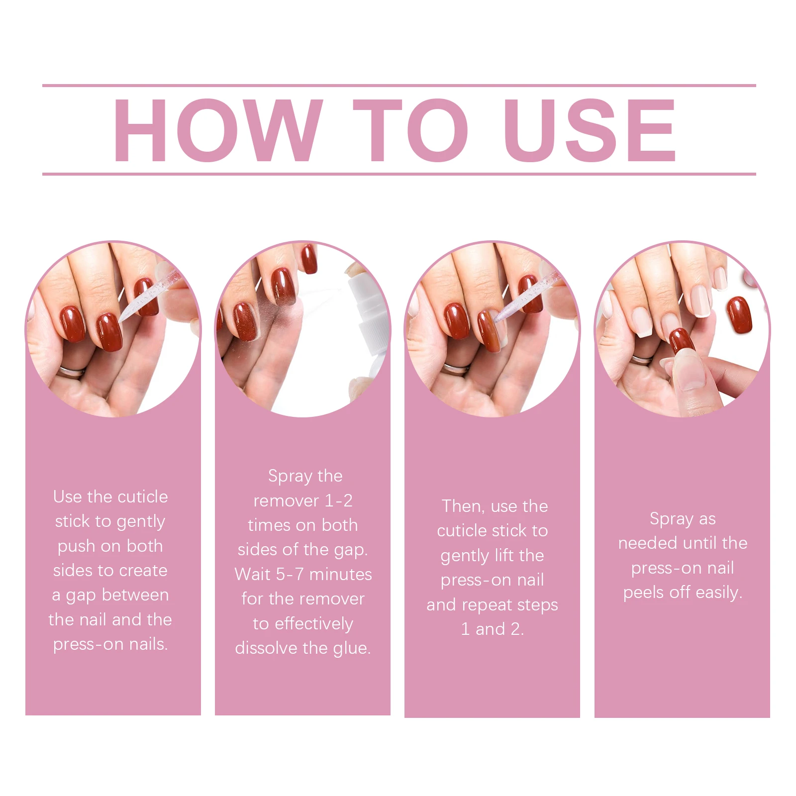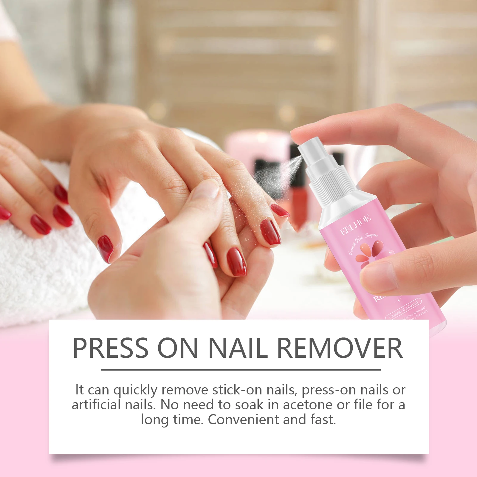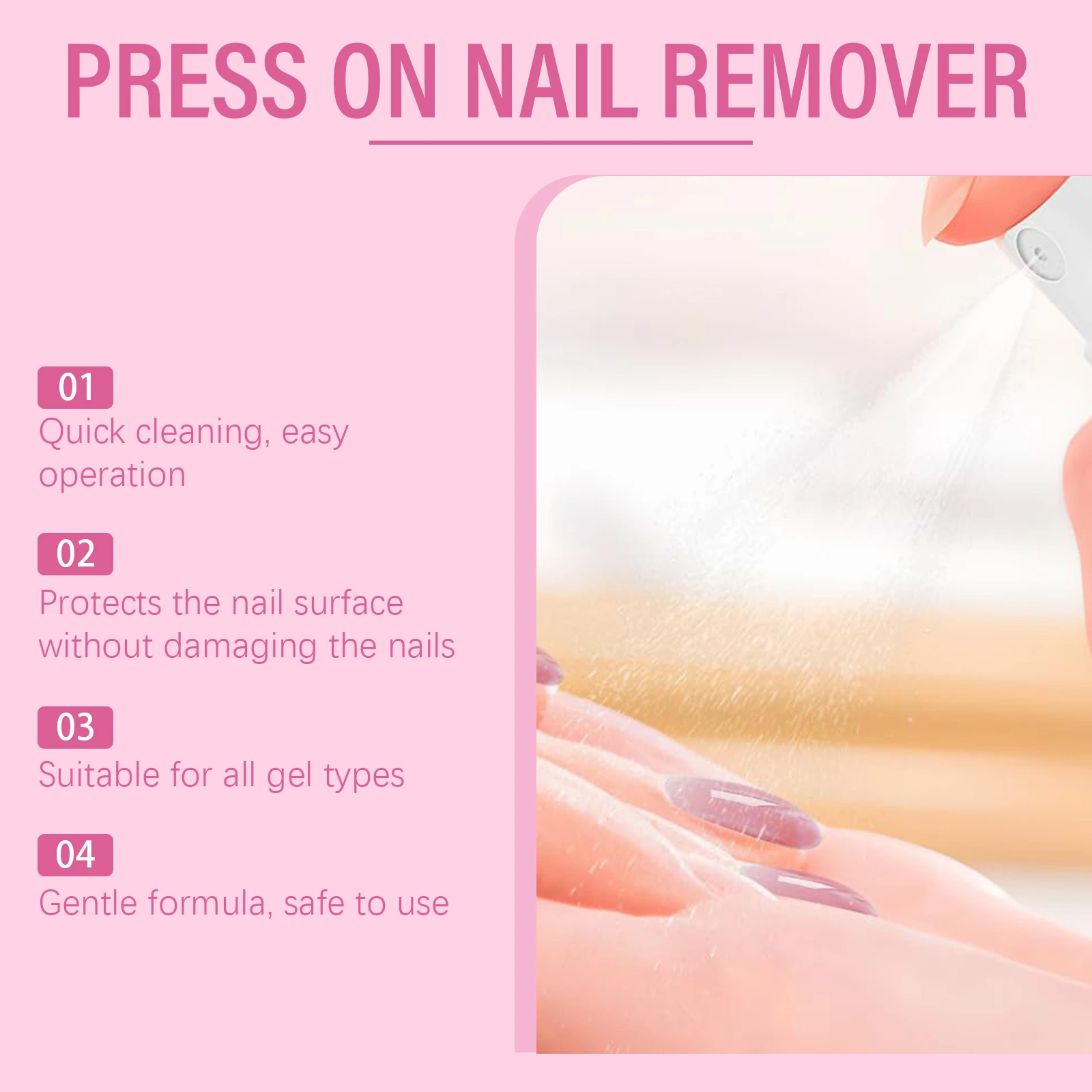 Our nail glue remover contains tocopherol (vitamin E), ethyl acetate and glycerin. It can quickly remove sticky nails, nail compression or artificial nails. Does not need to soak in acetone or file for a long time. Convenient and fast. The method of applying it is simple: 1. Gently press the sides of the nail with the cuticles to create a gap between the nail and the nail being pressed. 2. Spray 1-2 times on both sides of the gap. Wait 5-7 minutes for the stain remover to dissolve the glue effectively. 3. Then, use the cuticle stick to gently lift the pressed nail and repeat steps 1 and 2. 4. Spray as needed until nails fall off easily after pressing. Tocopherol is added to protect every inch of the nail surface. No strong odor, to provide users with a comfortable experience.