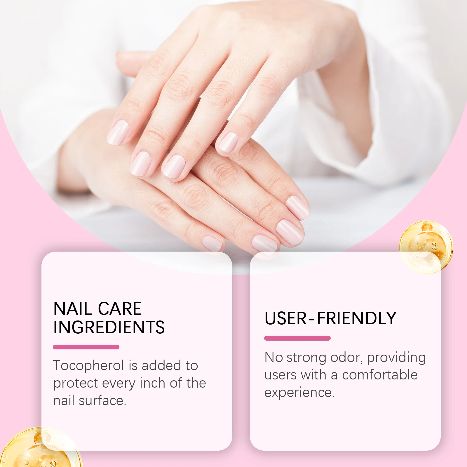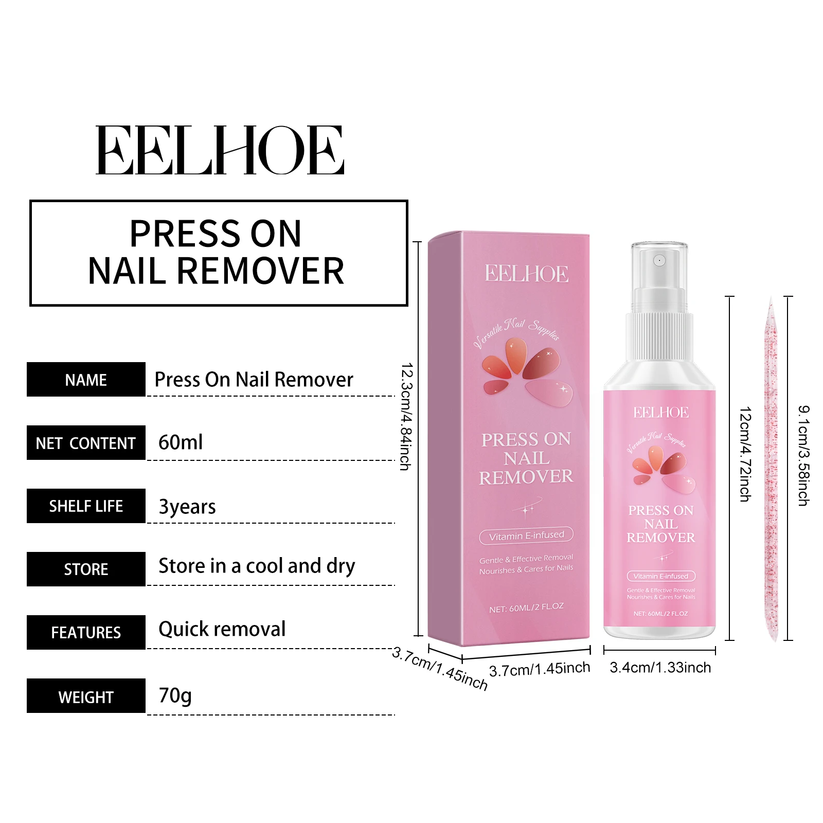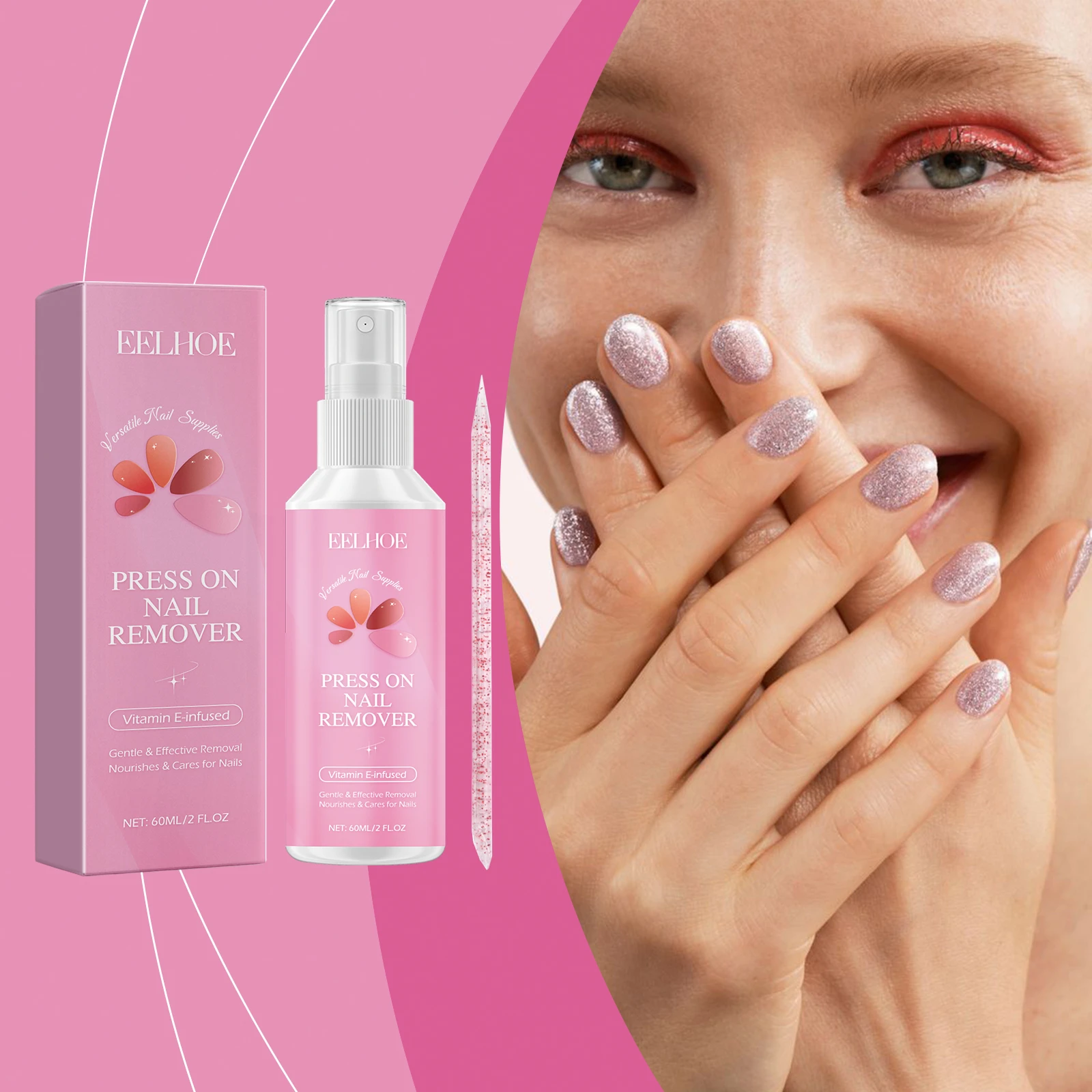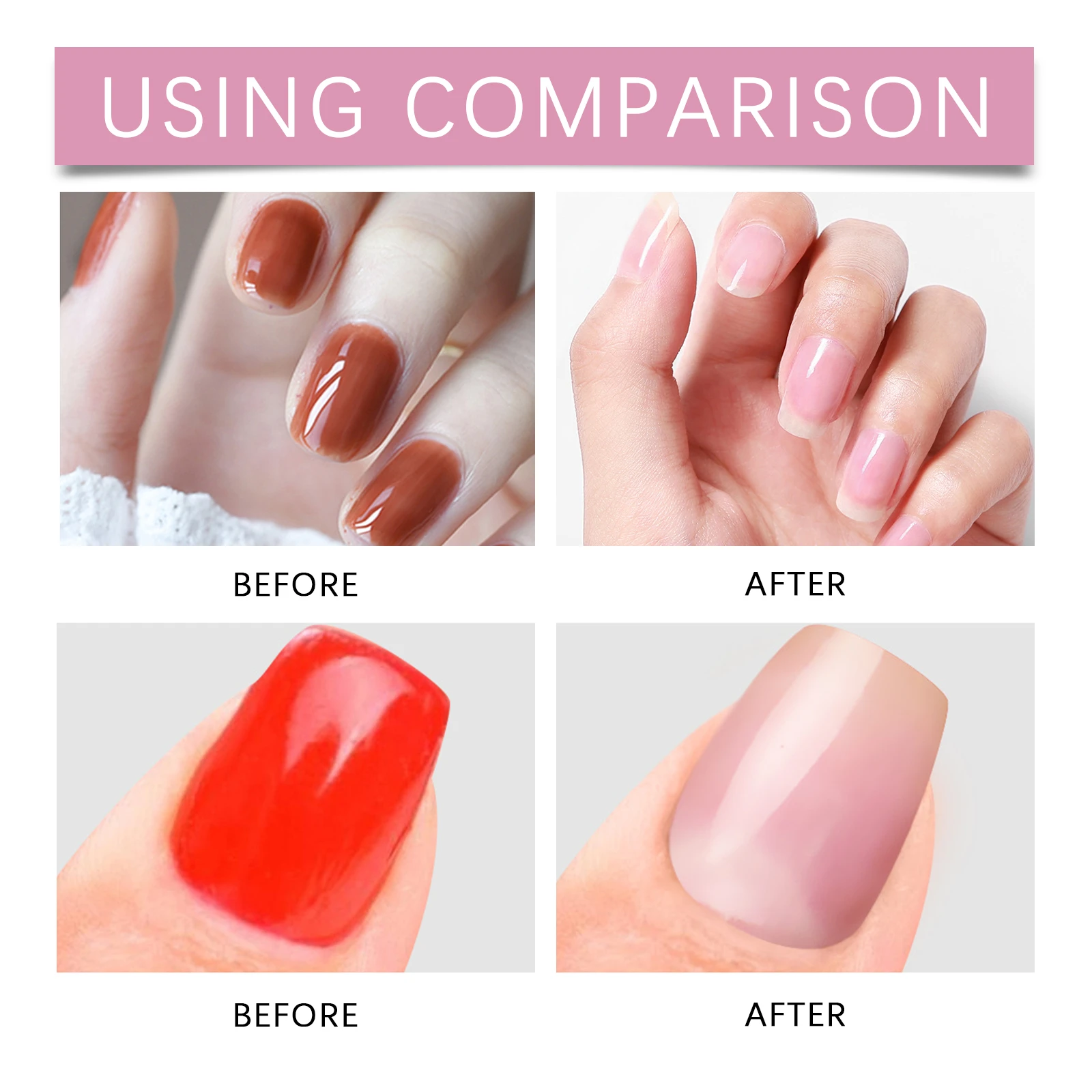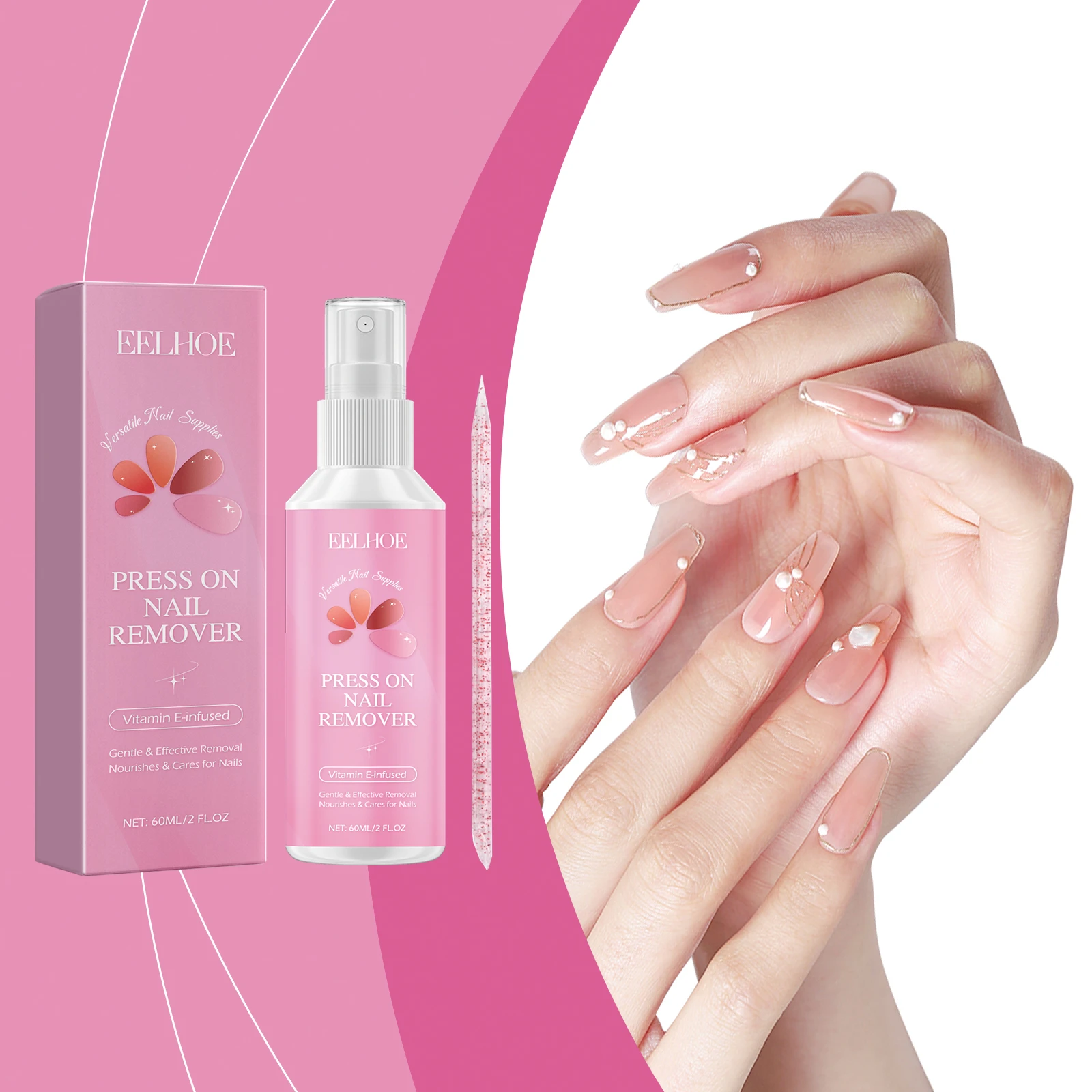 Our nail glue remover contains tocopherol (vitamin E), ethyl acetate and glycerin. It can quickly remove sticky nails, nail compression or artificial nails. Does not need to soak in acetone or file for a long time. Convenient and fast. The method of applying it is simple: 1. Gently press the sides of the nail with the cuticles to create a gap between the nail and the nail being pressed. 2. Spray 1-2 times on both sides of the gap. Wait 5-7 minutes for the stain remover to dissolve the glue effectively. 3. Then, use the cuticle stick to gently lift the pressed nail and repeat steps 1 and 2. 4. Spray as needed until nails fall off easily after pressing. Tocopherol is added to protect every inch of the nail surface. No strong odor, to provide users with a comfortable experience.
