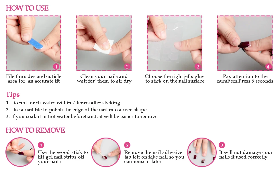 - ~Suggestion~ *The glue included in the package tends to dry out due to shipping, so we recommend you use your own glue. *Nail glue sheets are more suitable for temporary tasks, easy to peel off and more friendly to natural nails.
